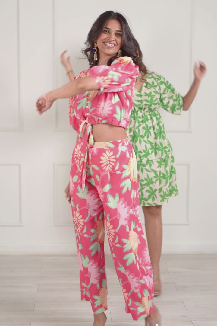 This stunning co-ord set features a vibrant floral print in shades of pink, yellow and green. The top is a cropped style with a V-neckline and puffy sleeves. The trousers are wide-legged and flowy for a comfortable and stylish look. The set is perfect for casual occasions like brunch, shopping, or a day out with friends. It's made from lightweight rayon printed fabric, making it perfect for warm weather.