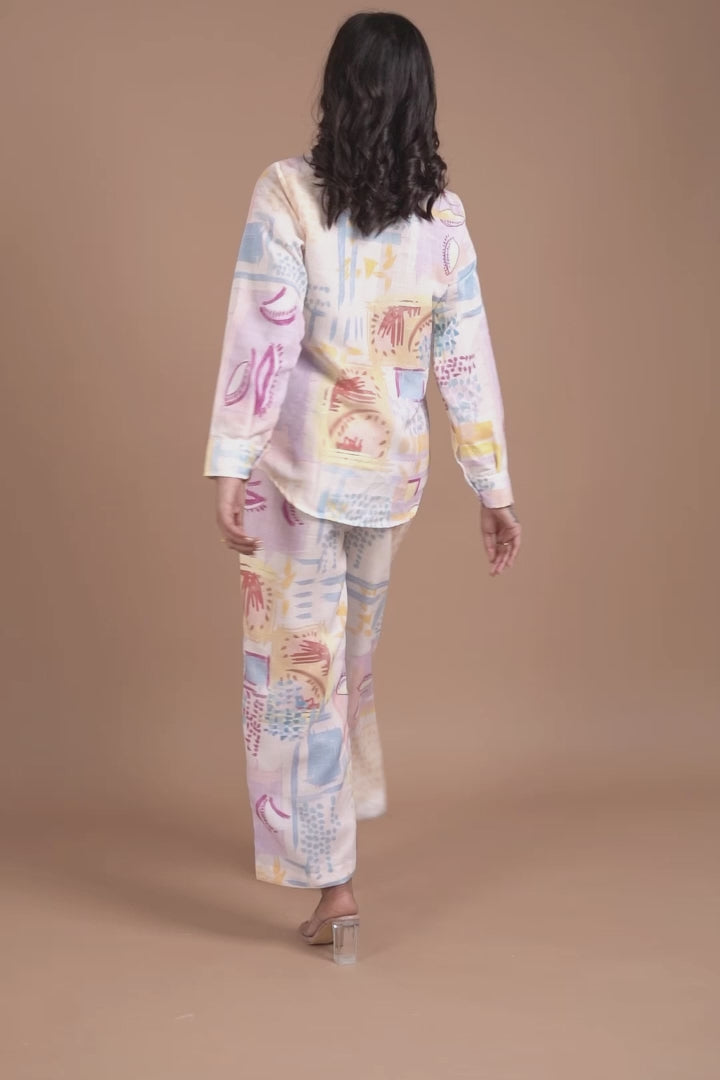 This co-ord set features a relaxed fit shirt and pants, both crafted from high-quality linen fabric for breathable comfort. The vibrant and abstract print adds a playful touch to your everyday style. This versatile set can be dressed up or down for various occasions.