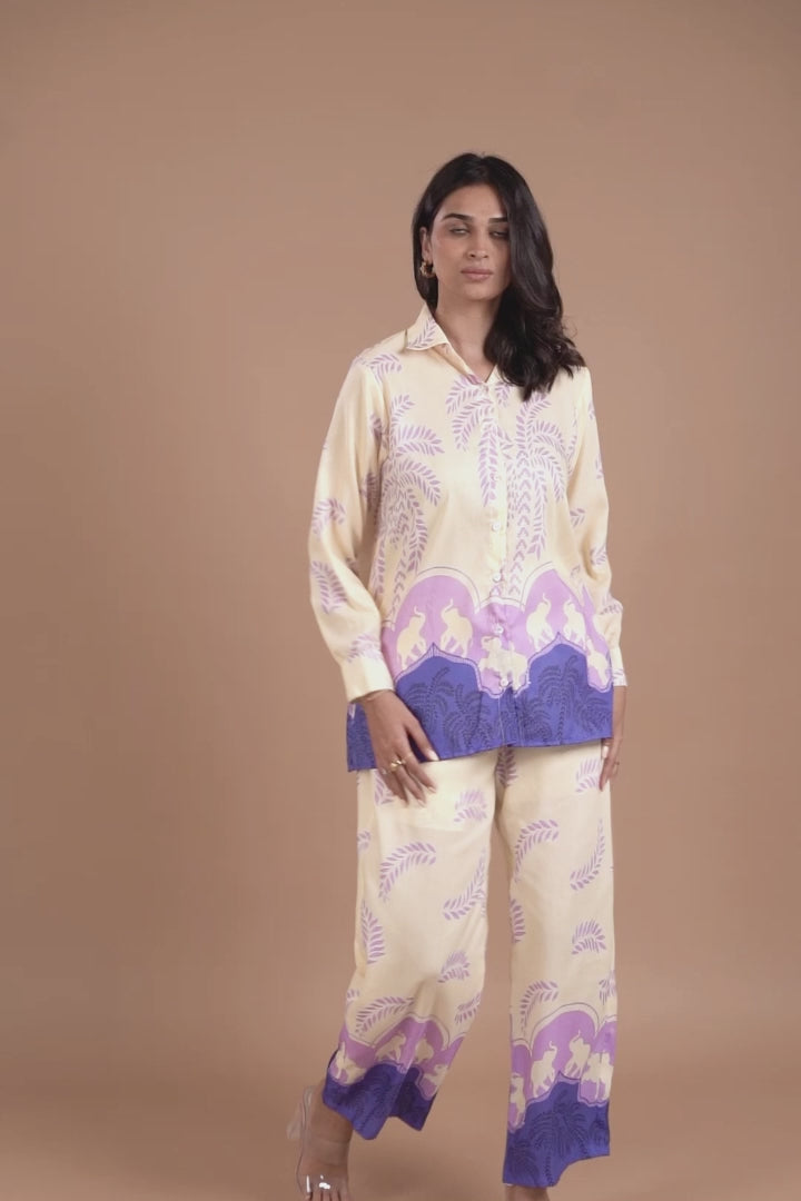The Muslin Printed Co-ord Set is a stylish and comfortable choice for everyday wear. Crafted from breathable and lightweight muslin fabric, this set features a relaxed fit for ultimate comfort. The vibrant print, featuring elephants and floral motifs, adds a touch of whimsy and elegance to your look. The shirt has a classic collar and long sleeves, while the pants are wide-legged and flowy, making them perfect for hot weather. This co-ord set is a versatile piece that can be styled up or down, making it ideal for various occasions.