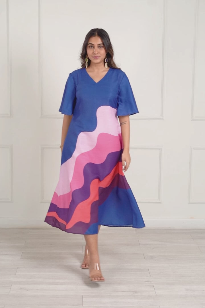 Embrace a touch of vibrant style with the Wavy Printed Midi Dress. Crafted from soft and breathable muslin, this dress features a captivating geometric pattern of flowing waves in shades of blue, purple, and pink. Its A-line silhouette flatters all figures, while the short, flutter sleeves add a touch of femininity. The dress is perfect for casual outings, brunch dates, or simply enjoying a relaxed day. Pair it with sandals or sneakers for a comfortable and trendy look.